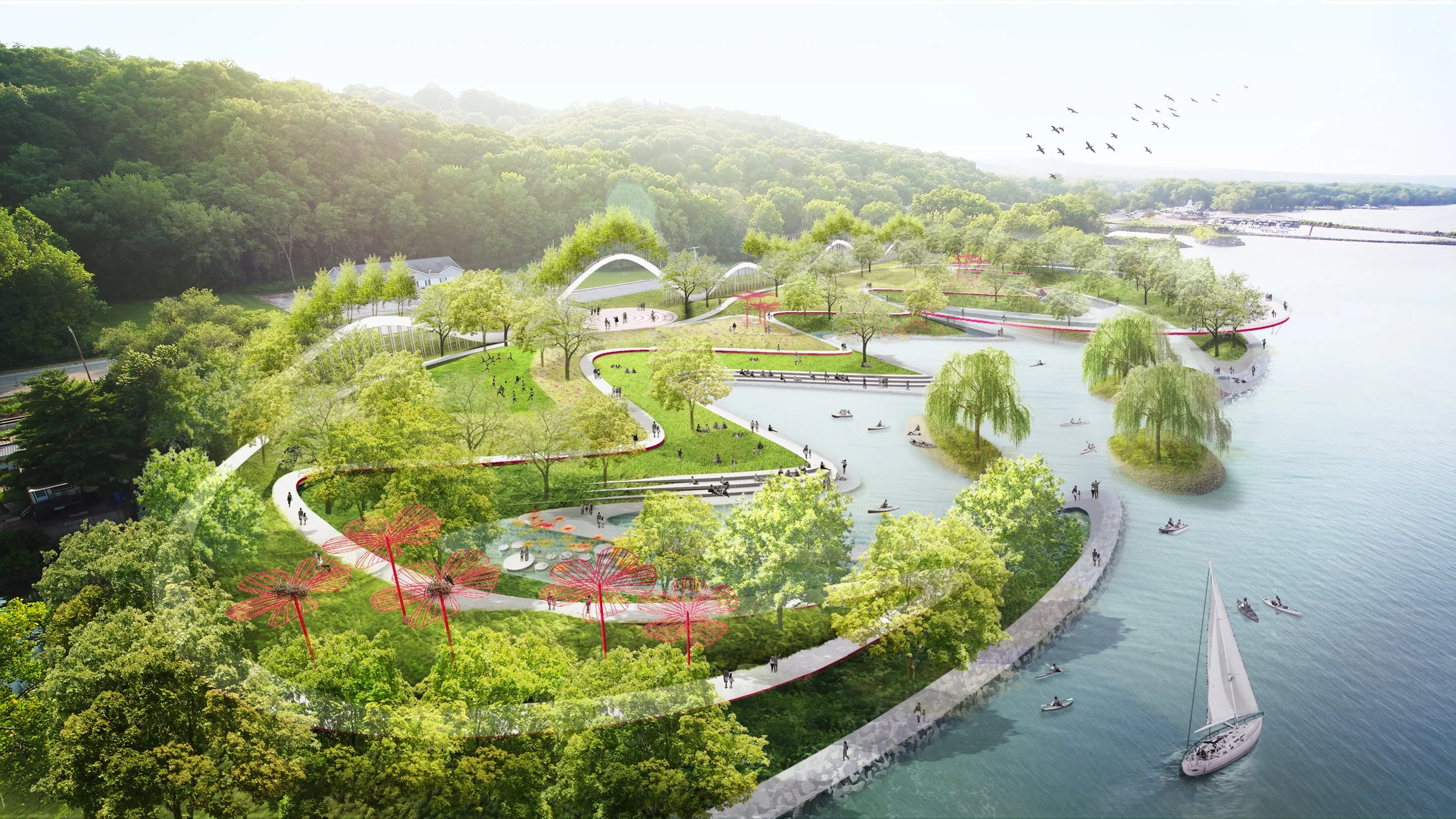 Taken together this offers visitors an experience of “Ecological Amusement” weaving together the rich natural and cultural history found on the site while showcasing plants from the riparian zone. “Ecological Amusement” also merges the Illinois River’s flooding dynamics with the history of the site as an amusement park. Ecological art installations inspired by plant species of the Illinois River floodplain are interspersed throughout Al Fresco Botanical Gardens that perform as habitat for fish, birds, and other wildlife. The botanical garden also provides active recreational opportunities such as kayaking, birdwatching, fishing, and ice skating. Flexible lawn spaces allows for an array of programming, including concerts, festivals, weddings, and picnicking. The River Walk, Floodplain Walk, and Forest Walk are pathways designed specifically for educating the public about the diverse native plant and animal species of this unique riverfront landscape.