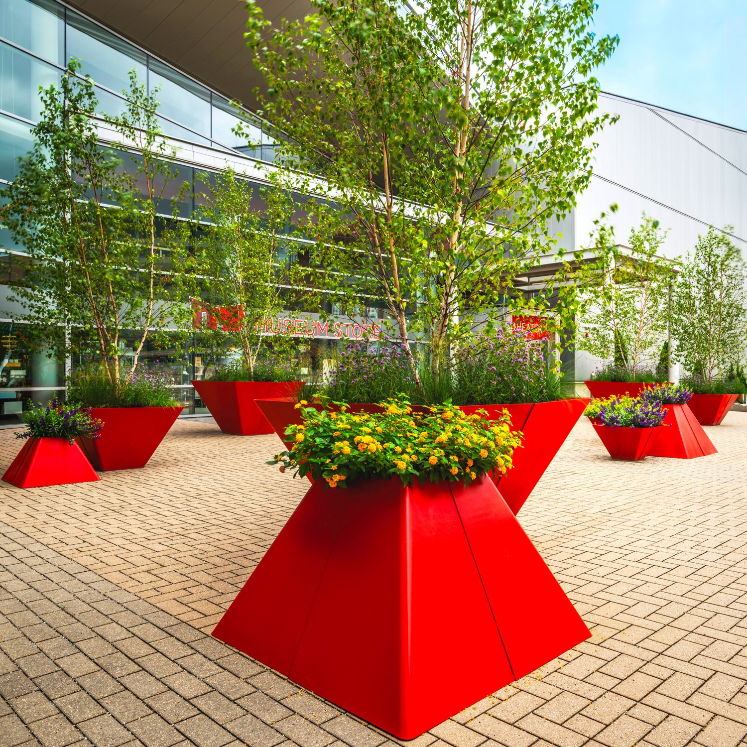 The Fold Garden at the Peoria Riverfront Museum transforms a previously unused plaza into an outdoor gallery and event space defined by a River Birch grove contained in sculptural planters. River Birch are native to riparian landscapes found throughout Illinois riverfront landscapes. Bright red custom folded steel planters form an interplay of color between the deep green foliage of the trees and native Prairie Dropseed grasses. Seasonal annuals Purpletop Vervain and Yellow Lantana add a dash of color throughout the year.